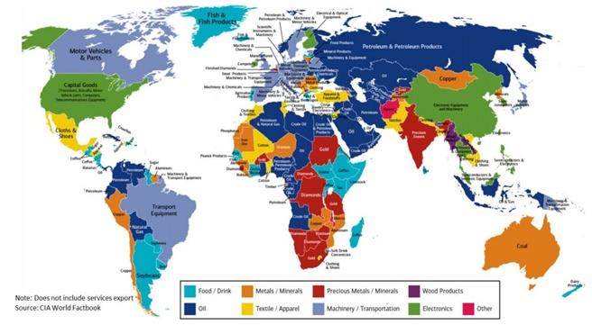 世界各國的出口商品有哪些?從地圖顏色標(biāo)示中看得一清二楚。(圖/截取美林美銀報告)